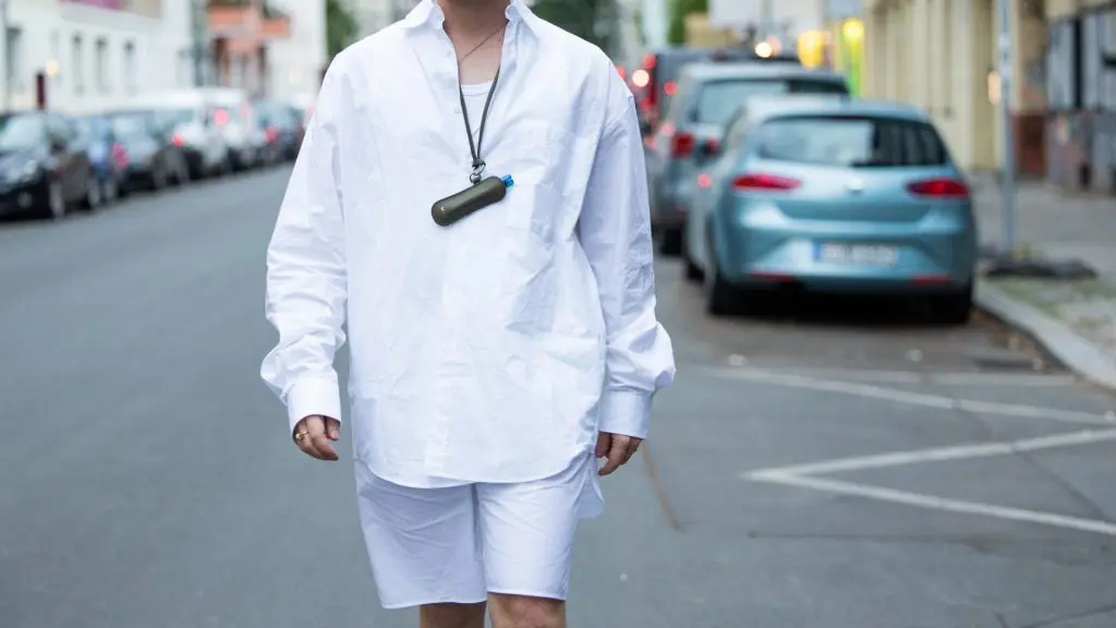 تميّز القميص بتفاصيل غير تقليدية، حيث تظهر على واجهته آثار داكنة تحاكي احتراق القماش وانكماشه في مناطق متفرقة، ضمن أسلوب يُعرف بالإطلالة “التالفة” الذي تتبناه بعض دور الأزياء الفاخرة لإضفاء لمسة جريئة على القطع الكلاسيكية.