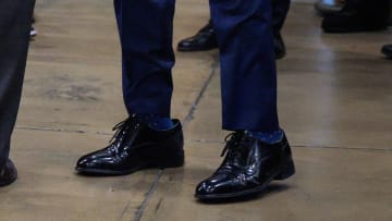 يعتمد الرئيس الأمريكي الألوان الفاتحة في مقابلات أقل رسمية. Credit: Photo by Andrew Harnik/Getty Images
