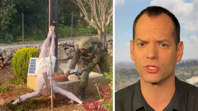 صورة تُظهر جنديًا إسرائيليًا يُلحق أضرارًا بتمثال المسيح في لبنان