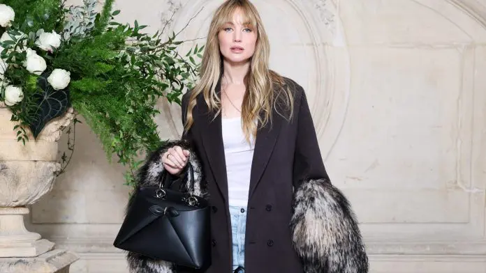 حضرت الممثّلة الأمريكية جينيفر لورنس العرض الباريسي مرتدية معطفًا طويلًا باللون البني الشوكولا مزينًا بأكمام فرو من مجموعة “ديور” للرجال، ونسّقته مع قميص أبيض كلاسيكي، وجينز واسع، وحذاء أسود مدبّب بكعب، في إطلالة أنيقة وغير متكلّفة.