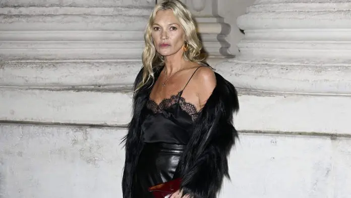اختارت الممثلة الأمريكية كيت موس توب بلا أكمام يشبه ملابس النوم، نسّقته مع تنورة جلدية سوداء ضيقة، وأضافت فوقهما معطفًا من الريش الأسود، فيما كسرت حدّة اللون الأسود بحقيبة “كلاتش” باللون البرغندي.
